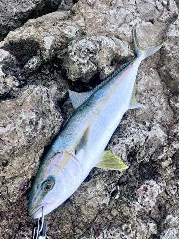 磯際での最後の突っ込みを耐え凌ぎ、タモに収まったのは見事なヒラマサ!サイズは80センチ級、磯からの1本はやはり格別です!