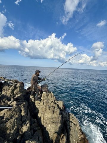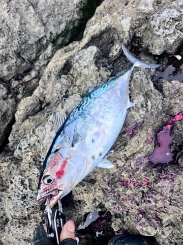 今度は一気に沖へ走る!マグロか!?と期待に胸を膨らませてファイトするも、引きが若干横走り。上がってきたのはスマガツオ。本命ではないが、磯からこのサイズは立派な釣果。この日の魚たちの活性の高さに、さらに期待が高まります。