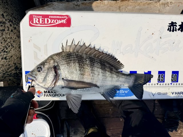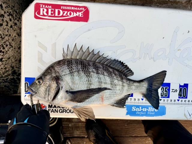 上がってきたのは、黒光りする見事な寒チヌ!厳しい条件下で引き出した一匹は格別です。