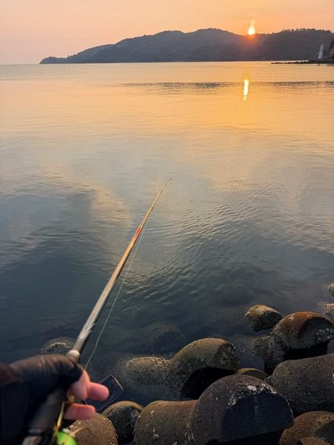 まだ夜気が残る午前6時、期待を込めて第1投。潮の流れと馴染みを確認し、微調整を加えて投じた第2投目でした。